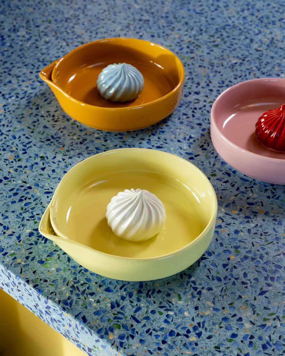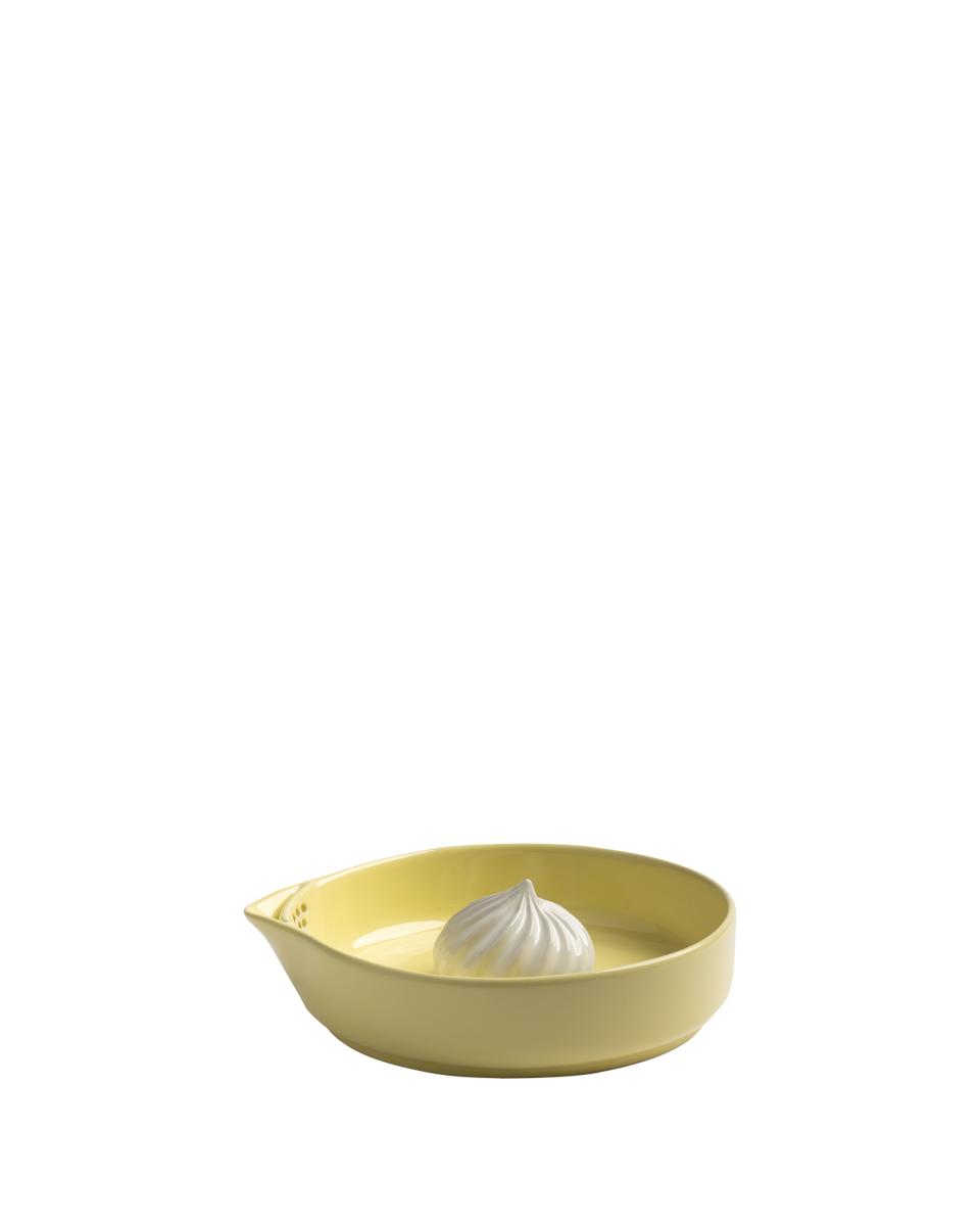 Wyciskacz do cytrusów w kształcie miseczki z bezą w kolorze maślanym. Wykonany z ceramiki kamionkowej wysokiej jakości, jest odporny na zarysowania i łatwy w utrzymaniu czystości – nadaje się do mycia w zmywarce bez utraty koloru czy funkcji.