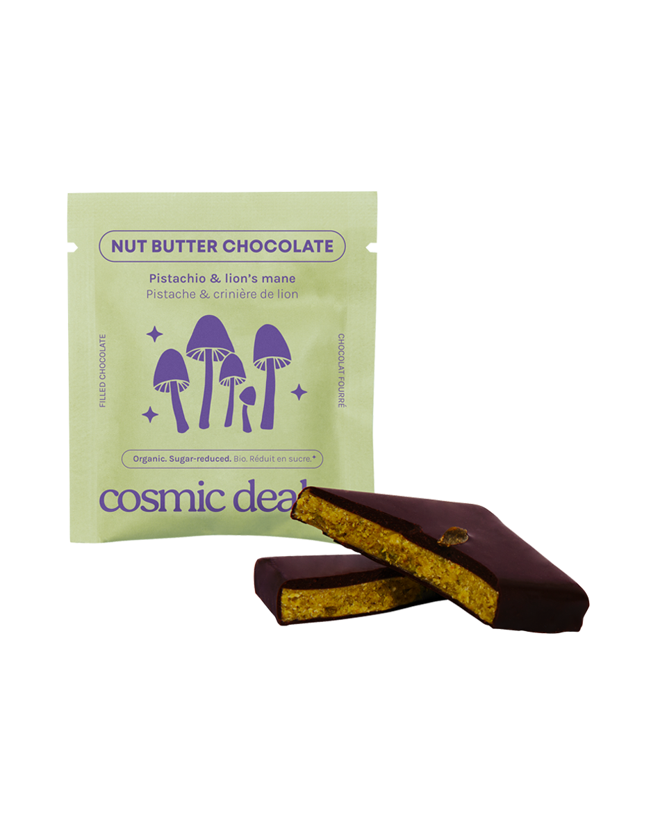 Duże kostki ciemnej czekolady wypełnione aksamitnym masłem pistacjowym i chrupiącymi pistacjami, wzbogacone ekstraktem z niezwykłego grzyba Lion’s Mane, tworzą wyjątkową, odżywczą przekąskę. Całość oblewana jest organiczną, single-origin, 75% ciemną czekoladą. Ekstrakt z Lion’s Mane użyty w produkcie jest najwyższej jakości organicznej, pochodzi wyłącznie z owocników, w formie czystego ekstraktu, przebadanego przez niezależne laboratoria. Produkt został wyróżniony trzema gwiazdkami w Nourish Awards 2024, co potwierdza jego wyjątkowość i wartość jako zdrowej przekąski. Czekoladki zawierają aż o 80% mniej cukru niż tradycyjne tabliczki, a słodycz pochodzi wyłącznie z naturalnego, nierafinowanego cukru z daktyli. Skład jest krótki i w pełni przejrzysty – bez sztucznych słodzików i alkoholi cukrowych. Czekolada została przebadana w niezależnym laboratorium, co daje pełen spokój i pewność jakości. Opakowanie wykonano z papieru nadającego się do recyklingu, a użyte kakao jest w pełni identyfikowalne. Produkt jest w 100% wegański, certyfikowany ekologicznie i ręcznie wytwarzany we Francji.