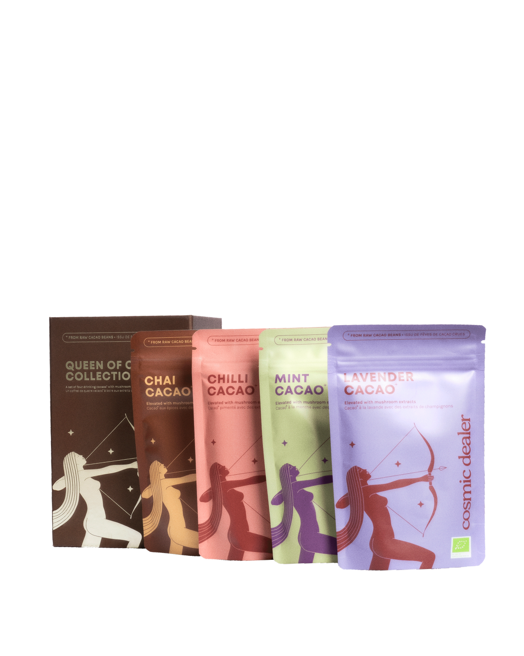| Skład | Chai Cacao z surowymi ziarnami kakaowca: Lucuma w proszku,* Kakao w proszku z surowych ziaren kakaowca (46,9%),* Kardamon w proszku (5%),* Cynamon w proszku (4,5%),* Mieszanka ekstraktu z grzybów w proszku* (Reishi (Ganoderma lucidum),* Soplówka jeżowata (Hericium erinaceus),* Maitake (Grifolafrondosa)*) (3,6%), Imbir w proszku,* Sól Chilli Kakao z surowymi ziarnami kakaowca: Lucuma w proszku,* Kakao w proszku z surowych ziaren kakaowca (41,5%),* Wanilia w proszku,* Mieszanka ekstraktu z grzybów w proszku*(Reishi (Ganoderma lucidum),* Soplówka jeżowata (Hericium erinaceus),* Maitake (Grifola frondosa)*) (3,6%), Ostra papryczka chilli (3%),* Sól lawenda Kakao z surowymi ziarnami kakaowca: Lucuma w proszku,* Kakao w proszku z surowych ziaren kakaowca (41,5%),* Mieszanka ekstraktu z grzybów w proszku* (Reishi (Ganodermalucidum),* Soplówka jeżowata (Hericium erinaceus),* Maitake (Grifola frondosa)*) (3,6%), Sól, Kwiat lawendy w proszku (1%)* Kakao miętowe z surowymi ziarnami kakaowca: Lucuma w proszku,* Kakao w proszku z surowych ziaren kakaowca (41,5%),* Słodka mięta w proszku (6,9%),* Ekstrakt z grzybów w proszku* (Reishi (Ganoderma lucidum),* Soplówka jeżowata (Hericium erinaceus),* Maitake (Grifola frondosa)*) (3,6%)* *z upraw ekologicznych. |