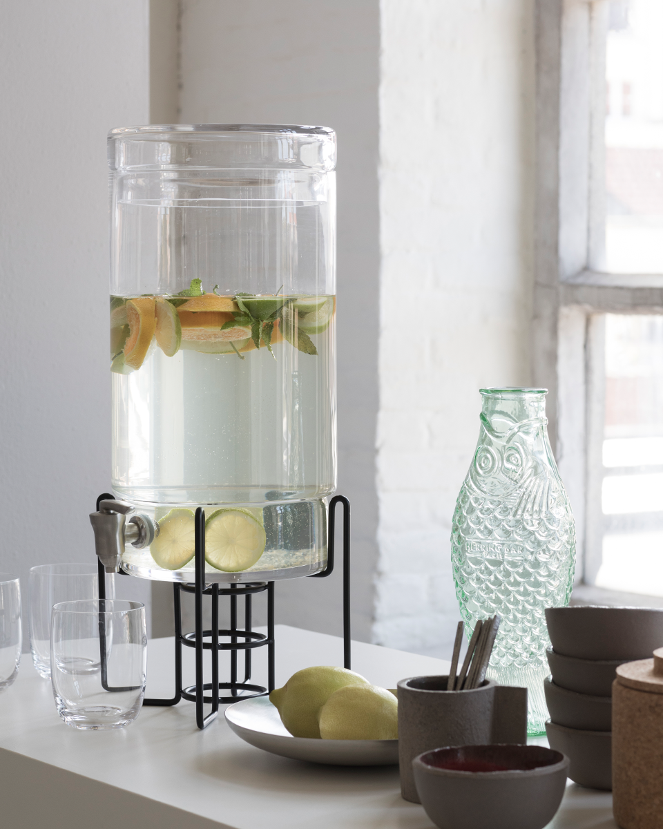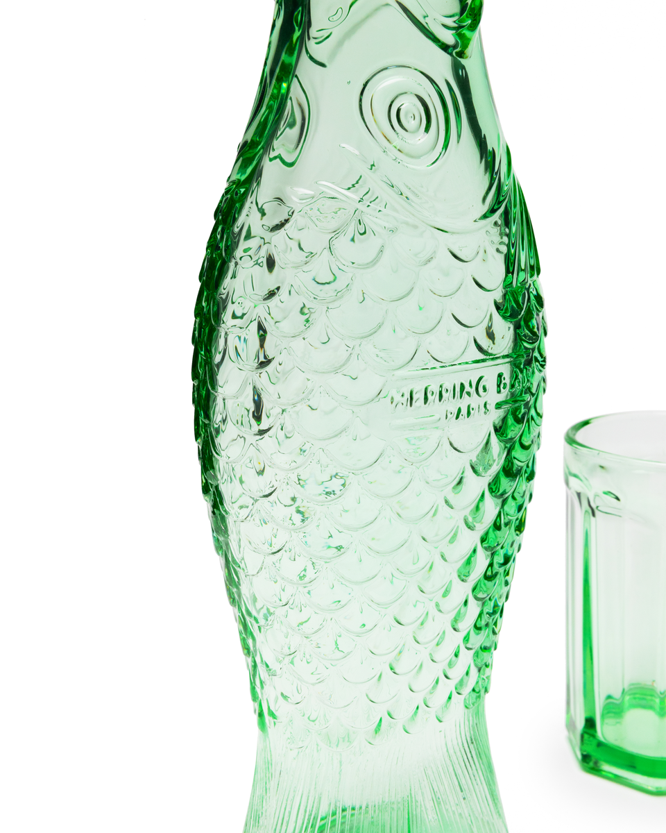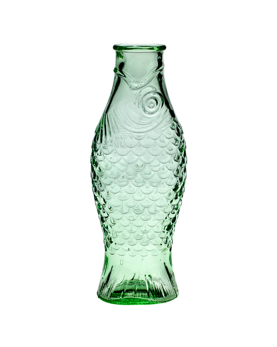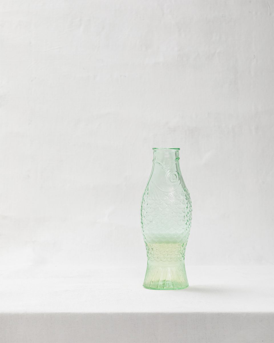 Karafka świetnie sprawdzi się do serwowania napojów, ale może pełnić też funkcję dekoracyjnego wazonu lub ozdobnego elementu wystroju. Doskonale komponuje się z naturalnymi materiałami, takimi jak len, kamionka czy ceramika, a w połączeniu z innymi kolorami z kolekcji Fish & Fish tworzy spójny, efektowny zestaw – idealny na letnie kolacje i aperitify.