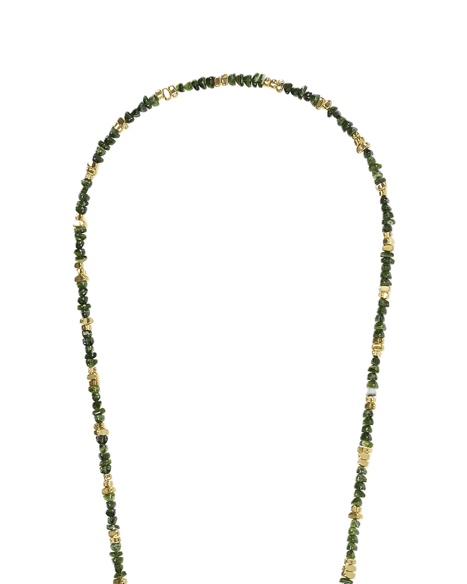Łańcuch składa się z drobnych pereł barokowych w zielonym kolorze i złotych koralików. Jest wykonywany ręcznie w Marsylii, więc każda smycz jest unikatowa. Ma 120 cm długości, co oznacza, że możesz ją nosić przez ramię jako cross body.