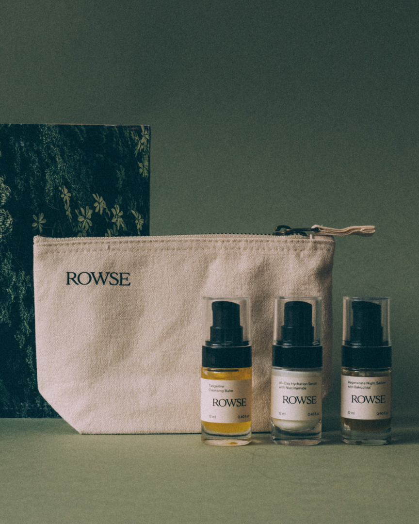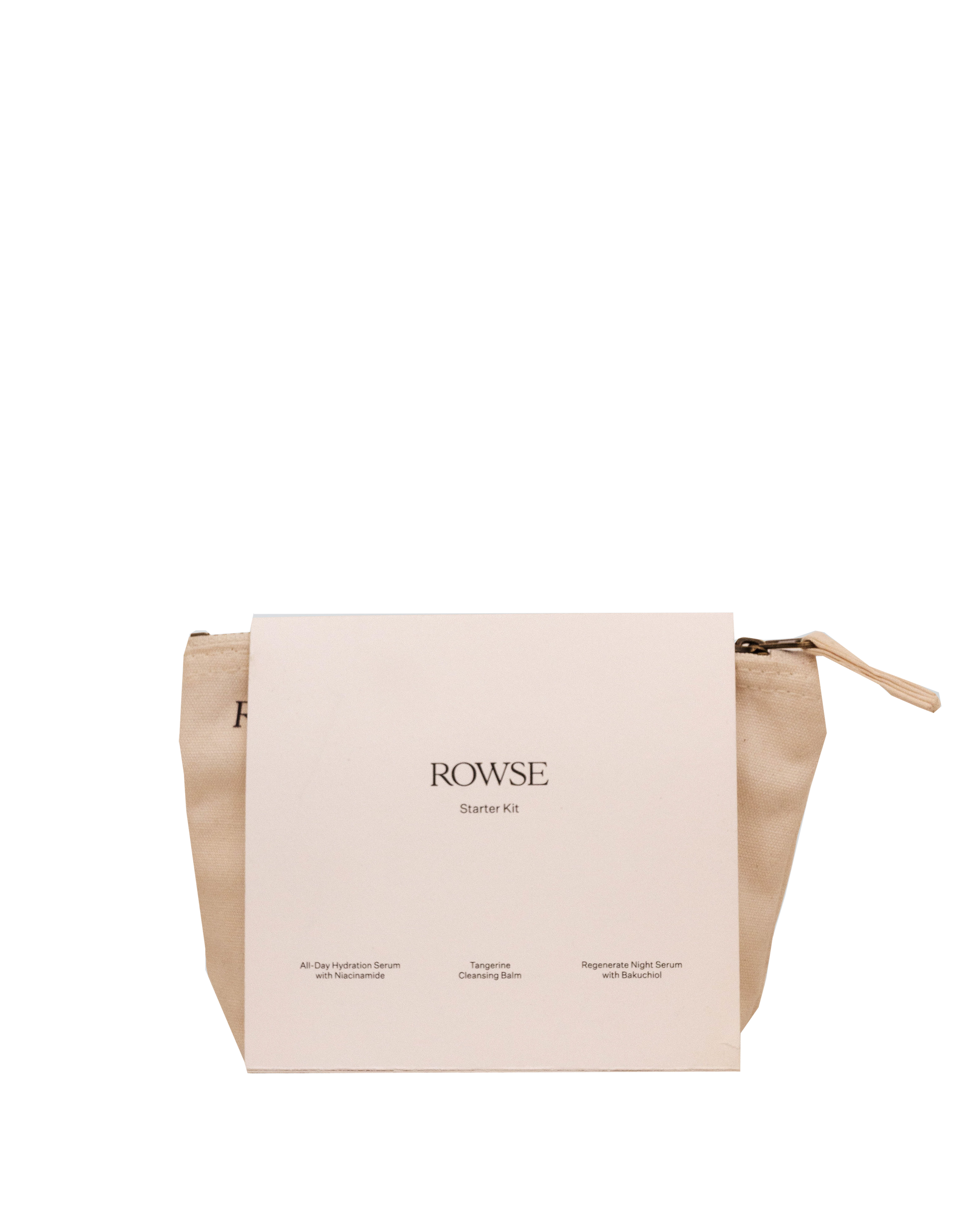 Bawełniana kosmetyczka zawiera trzy najlepiej sprzedające się produkty Rowse: Tangerine Cleansing Balm, All-Day Moisturizer with Niacinamide oraz Regenerate Night Serum with Bakuchiol. Kosmetyki niezbędne do kompletnej, całkowicie naturalnej oraz nietoksycznej pielęgnacji skóry. Odpowiednie dla każdego rodzaju skóry, do stosowania rano i wieczorem.